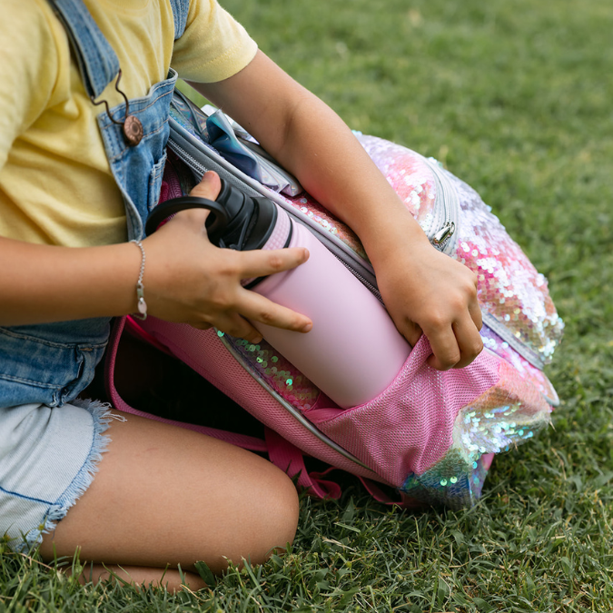 This 16-inch backpack for girls is perfect for school. It has a sparkly sequin design and comes with a matching lunch box for convenience and style. The spacious interior can hold all their school supplies, books, and personal items. Durable for daily use, this backpack adds fashion and function to their school days.